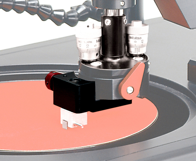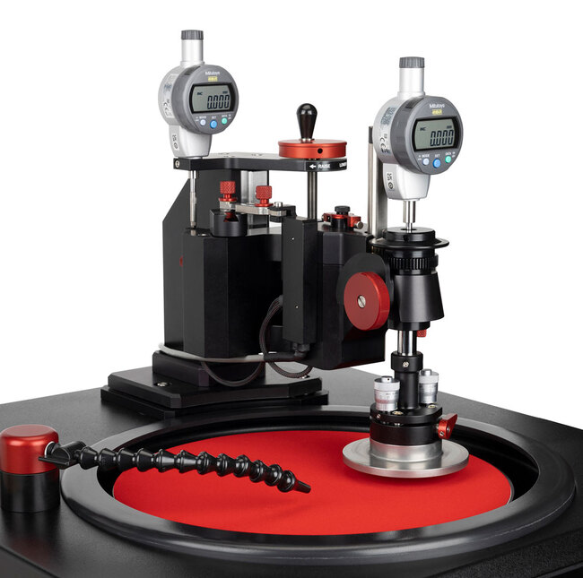 - 두 개의 마이크로미터는 연마면에 상대적으로 샘플을 정교하게 앞뒤 및 좌우로 기울여 연마가 가능하게 한다. 견고한 Z축 스핀들은 연마하는 동안 설정된 기하학적 방향을 유지시켜준다. 디지털 마이크로미터는 실 시간으로 연마된 양을 표시해 주며, 설정된 값을 넘지 않도록 해준다. 샘플 회전과 오실레이션은 연마 디스크 를 최대한 활용할 수 있게 하여 폴리싱 결함을 최소화 시킨다. 정밀한 하중 조절로 작고 깨지기 쉬운 샘플에 서 큰 샘플까지 작업이 가능하다.